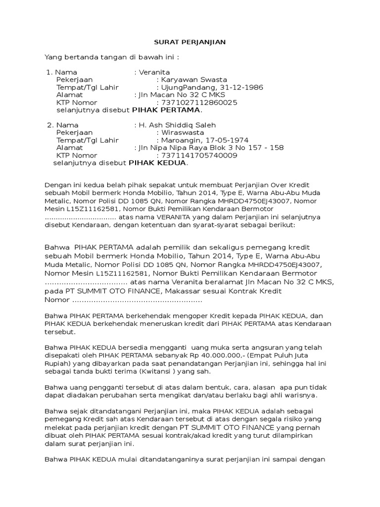 Contoh Surat Perjanjian Over Kredit Mobil Situs Pendidikan