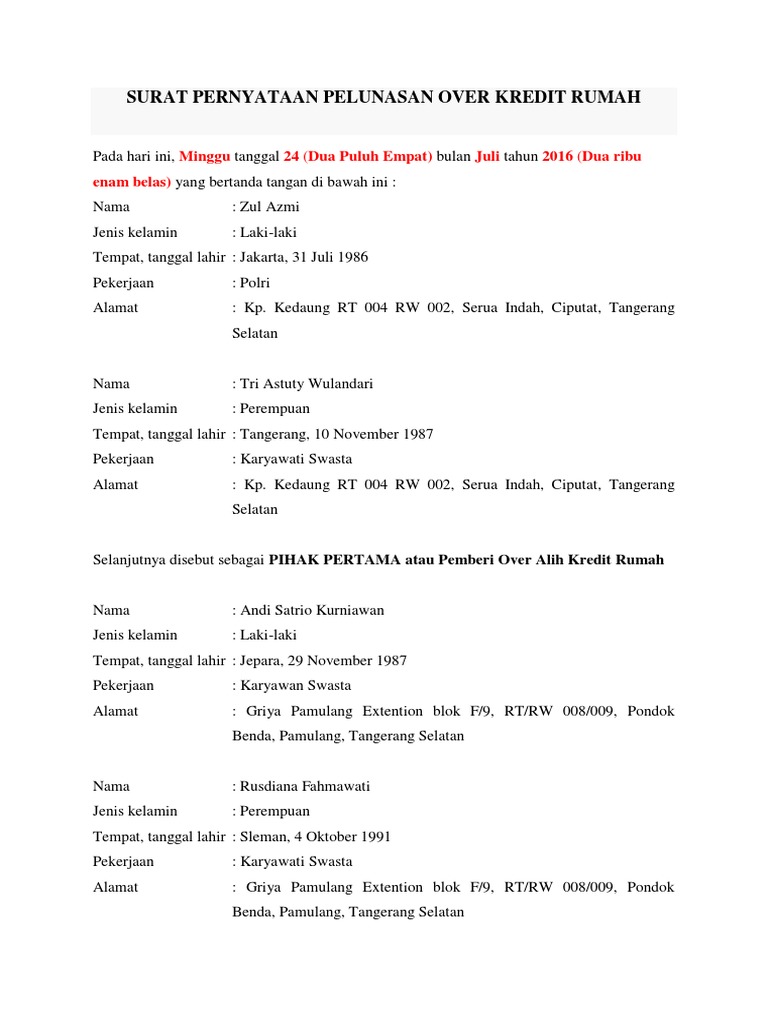 Surat Pernyataan Pelunasan Over Kredit Rumah 1