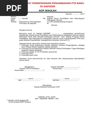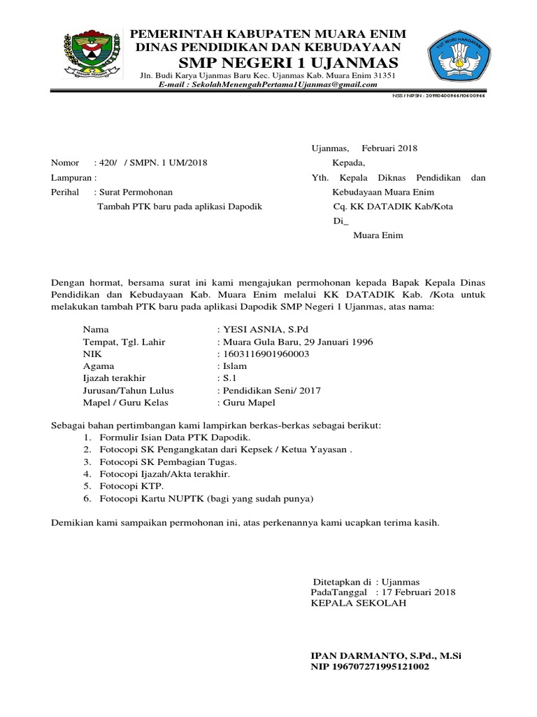 Contoh Surat Permohonan Penambahan Ptk Baru Di Dapodik
