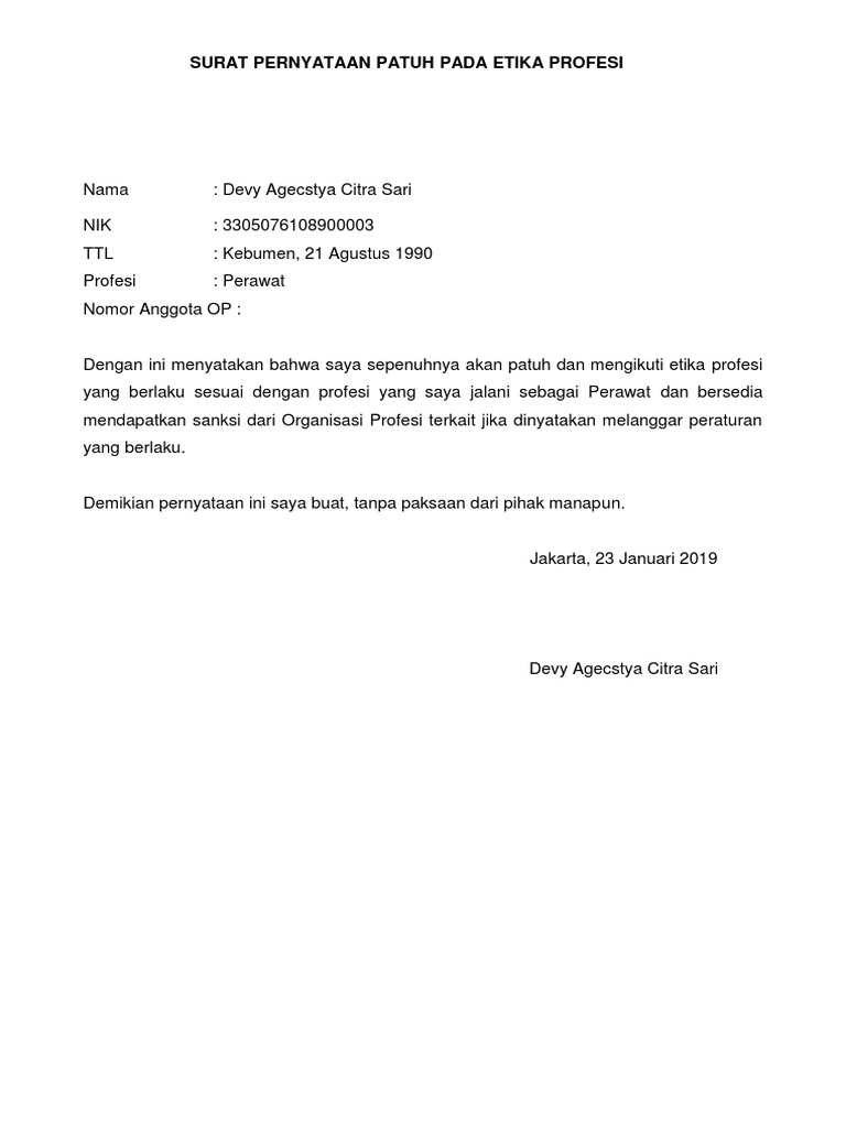Contoh Surat Pernyataan Patuh Pada Etika Profesi Perawat Archives
