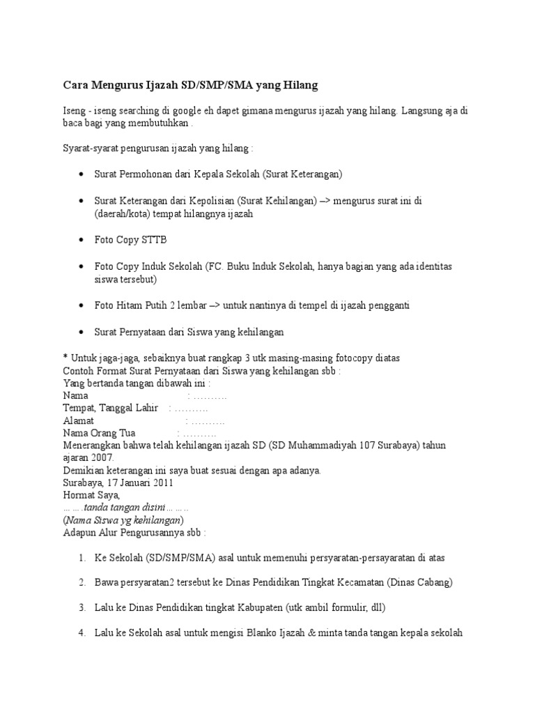 Contoh Format Surat Keterangan Hilang Ijasah Pengantar Ke Polisi