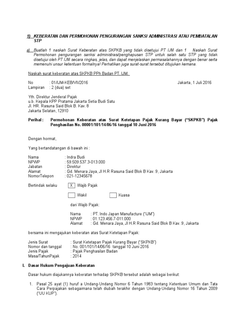 Contoh surat keberatan atas surat tagihan pajak. Pak saadi saya menerima kiriman surat tagihan pajak stp dari kantor pelayanan pajak jumlah tagihannya sangat memberatkan saya dapatkah saya mengajukan keberatan ke pihak kantor pelayanan pajak. Apabila surat ketetapan pajak kurang bayar atau surat ketetapan pajak kurang bayar tambahan serta surat keputusan pembetulan surat keputusan keberatan putusan banding atau putusan peninjauan kembali yang menyebabkan jumlah pajak yang masih harus dibayar bertambah pada saat jatuh tempo pelunasan tidak atau kurang dibayar atas jumlah. Surat keberatan yang tidak memenuhi persyaratan di atas bukan merupakan surat keberatan sehingga tidak dipertimbangkan dan tidak diterbitkan surat keputusan keberatan.