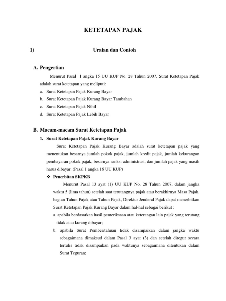 Dari pengertian diatas maka dapat disimpulkan bahwa surat ketetapan pajak kurang bayar merupakan surat keputusan besarnya jumlah pajak yang terutang jumlah kredit pajak jumlah kekurangan pembayran pokok pajak besarnya sanksi administrasi dan jumlah yang harus dibayar. Contoh surat surat ketetapan pajak adalah catatan informasi keuangan suatu perusahaan pada suatu periode akuntansi yang dapat digunakan untuk menggambarkan kinerja perusahaan tersebut. Untuk menampung kemungkinan terjadinya suatu skpkb yang ternyata telah ditetapkan lebih rendah atau pajak yang terutang dalam suatu surat ketetapan pajak nihil skpn ditetapkan lebih rendah atau telah dilakukan pengembalian kelebihan pembayaran pajak yang tidak seharusnya yang ditetapkan dalam suatu surat ketetapan pajak lebih bayar skplb.