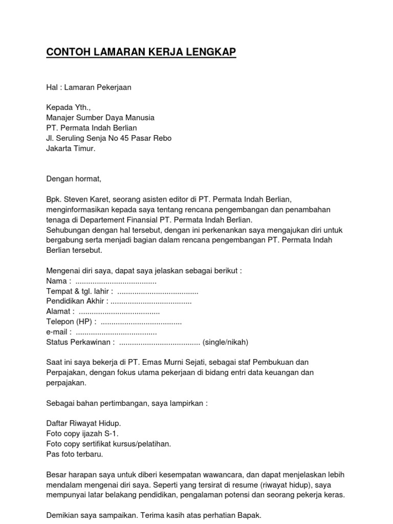 Contoh Lamaran Kerja Lengkap