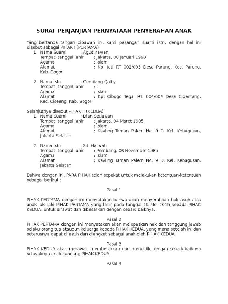 Kumpulan lengkap Contoh Surat Pernyataan Penyerahan Hak Asuh Anak.