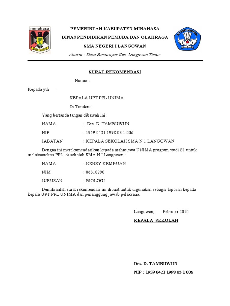 Contoh Surat Rekomendasi Mutasi Dari Kepala Sekolah