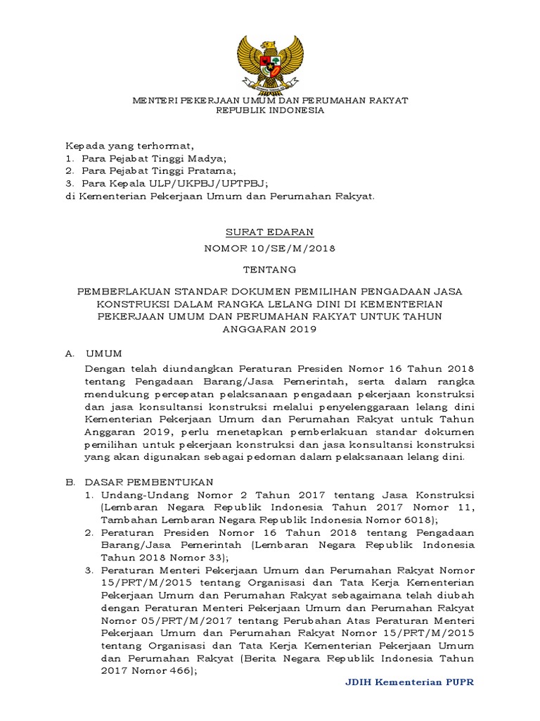 Surat edaran menteri nomor 10sem2019 12 juni 2019 496 kali 1069 kali program pengembangan keprofesian berkelanjutan tenaga ahli konstruksi indonesia peraturan menteri nomor 08prtm2019 12 juni 2019 1150 kali 1439 kali. Standar dokumen pemilihan yang telah diterbitkan oleh kementerian pupr melalui surat edaran nomor 10 tahun 2018 yang di tantangani pada 29 oktober 2018 tentang pemberlakukan standar dokumen pemilihan jasa konstruksi dalam rangka lelang dini di kementerian pekerjaan umum dan perumahan rakyat.