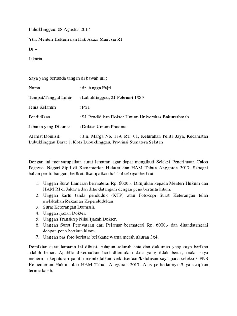 Contoh Surat Lamaran Dan Pernyataan Cpns Kemenkumham 2018