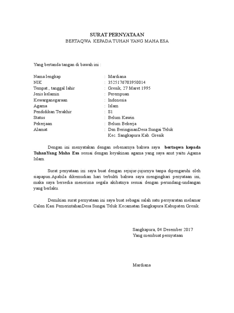 Berikut ini contoh surat pernyataan beriman dan bertaqwa kepada tuhan yang maha esa dengan memeluk dan menjalankan ajaransyariat agama islam sebagai salah satu syarat berkas calon kepala kampung atau perangkat desa. Contoh surat pernyataan bertaqwa kepada tuhan yang maha esa kelurahan desa surat pernyataan merupakan surat yang dibuat leh seseorang terhadap sesuatu surat pernyataan sangat banyak jenisnya mulai daripernyataan perjanjian pernyatan hal hal khusus. Surat pernyataan ini saya buat dengan sejujur jujurnya tanpa dipengaruhi oleh siapapun.