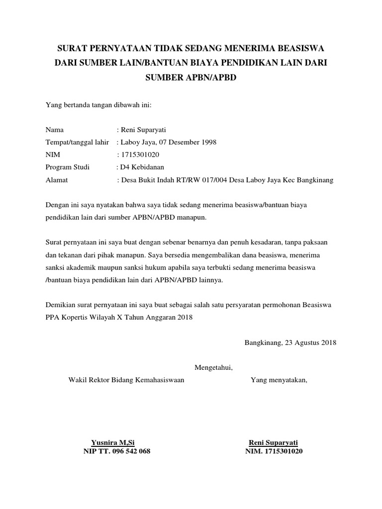 Surat pernyataan tidak sedang menerima bantuanbeasiswa pihak lain kepada yth. Saya bersedia mengembalikan dana beasiswa menerima sanksi akademik maupun sanksi hukum apabila saya terbukti juga menerima beasiswa dari sumberlembagainstansiyayasan lainnya. Surat pernyataan tidak sedang menerima beasiswa dari pihak lain surat pernyataan pada umumnya ialah untuk menyatakan atau menerangkan sesuatu kepada suatu instansi atau perorangan.