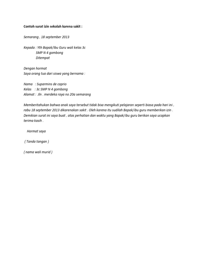 Berikut contoh surat izin orang tua yang bisa anda jadikan referensi. Contoh surat izin yang cocok untuk kamu yang sedang bingung mencari contoh surat saat sedang sakit ada acara keluarga atau saat orang tua yang harus menulis surat izin untuk kamu. Sehingga berbagai contoh surat izin orang tua akan anda butuhkan untuk memenuhi persyaratan persyaratan keperluan tersebut.