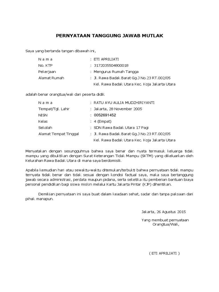 Jika ada sedang mencari Contoh Surat Keterangan Tanggung Jawab Mutlak Orang Tua.