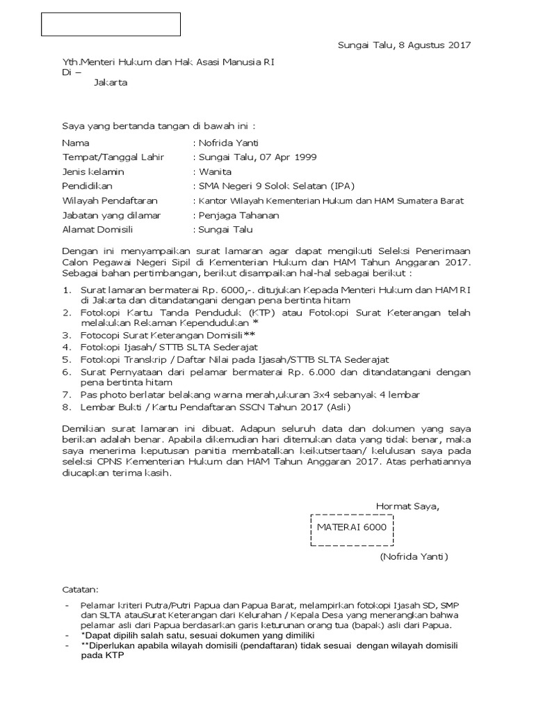 Contoh Surat Lamaran Dan Pernyataan Cpns Kemenkumham Sma Tahun 2017