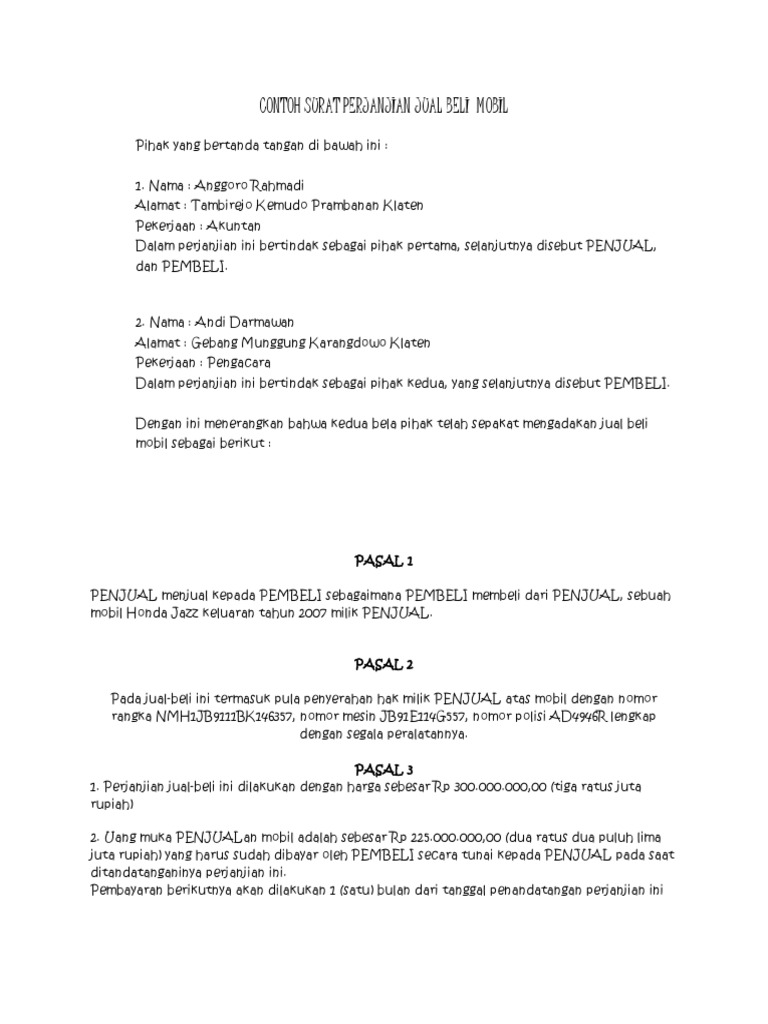 Contooh Surat Perjanjian Jual Beli Mobil