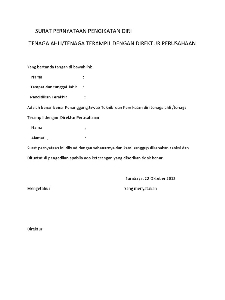 Berikut adalah detail Contoh Surat Pernyataan Pengikatan Diri Tenaga Ahli.