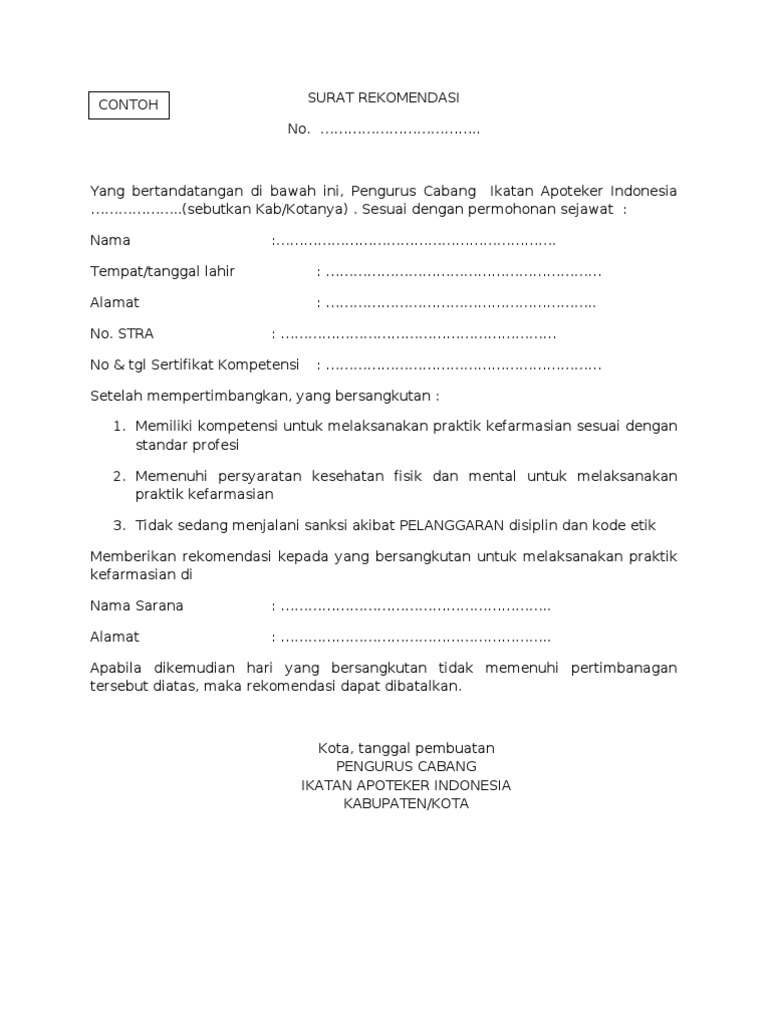 Surat Rekomendasi Kemampuan Dari Apoteker Yang Telah Memiliki Stra Atau