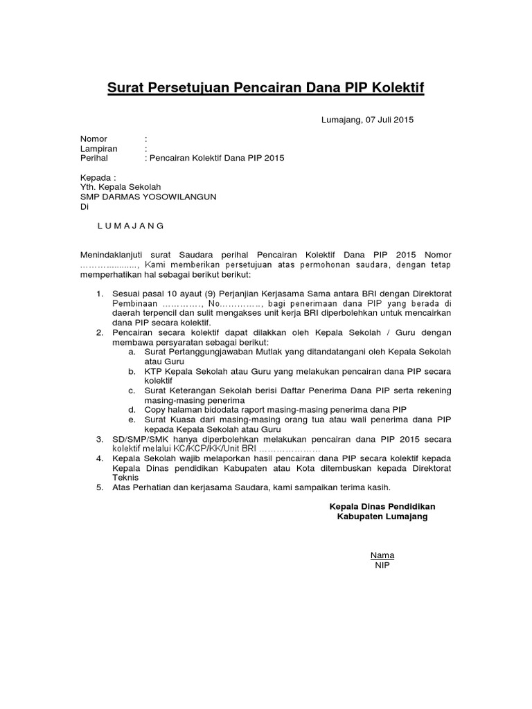 Surat Persetujuan Pencairan Dana Pip Kolektif