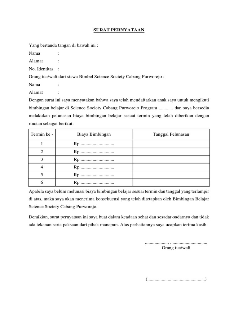 Surat pernyataan seperti ini bisa saja dipergunakan ketika sang anak tidak tinggal bersama orang tua ataupun tinggal bersama dengan keluarga lainnya. Surat pernyataan adalah surat yang dibuat oleh seseorang yang berisi pernyataan dirinya atau menerangkan orang lain bahwa orang tersebut pernah atau tidak pernah melakukan sesuatu. Surat pernyataan orang tua wali juga seringkali dibutuhkan untuk berbagai keperluan.