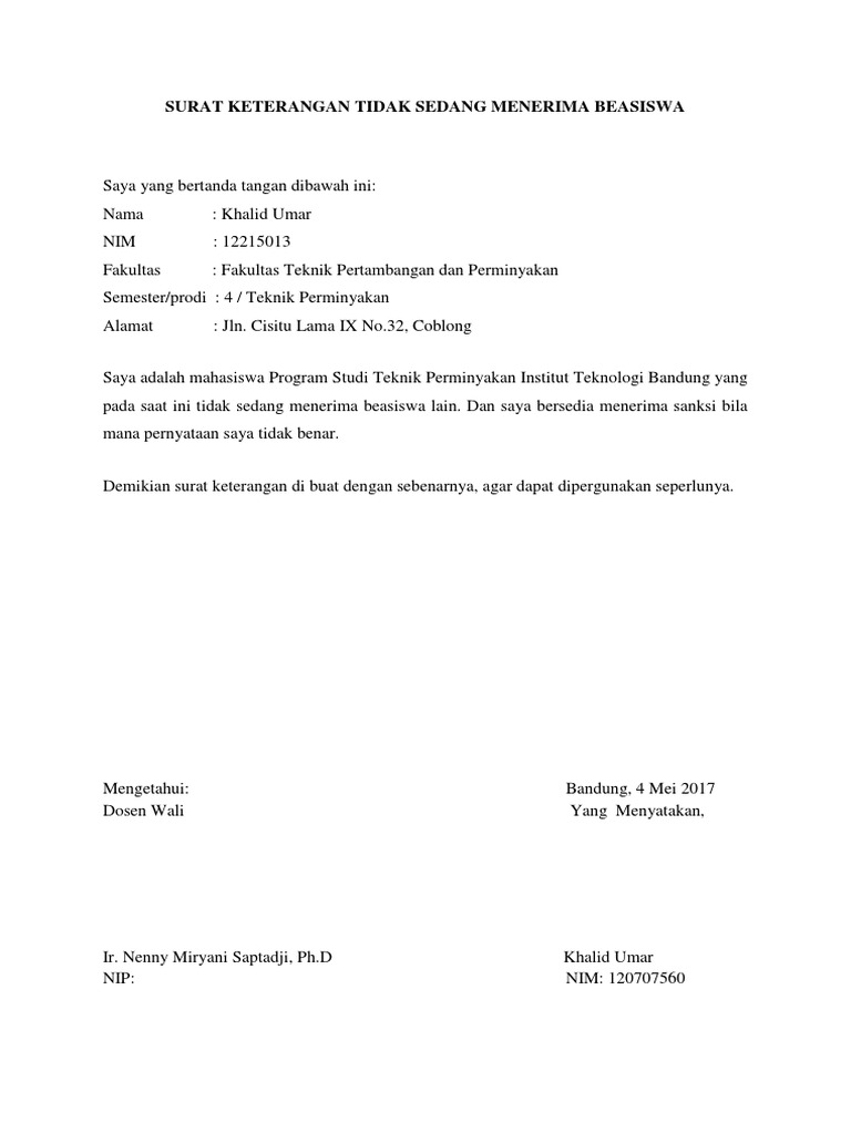 Surat Pernyataan Tidak Sedang Menerima Beasiswa Institut Teknologi