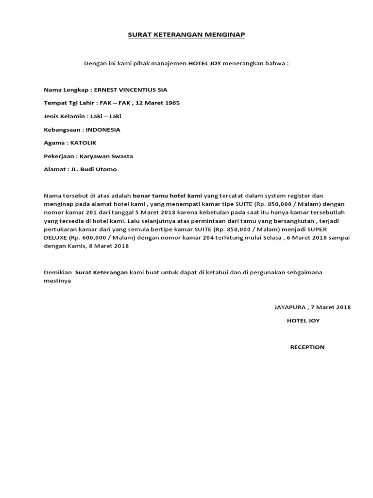 Berikut gambar-gambar mengenai Contoh Surat Pernyataan Tidak Menginap Di Hotel.