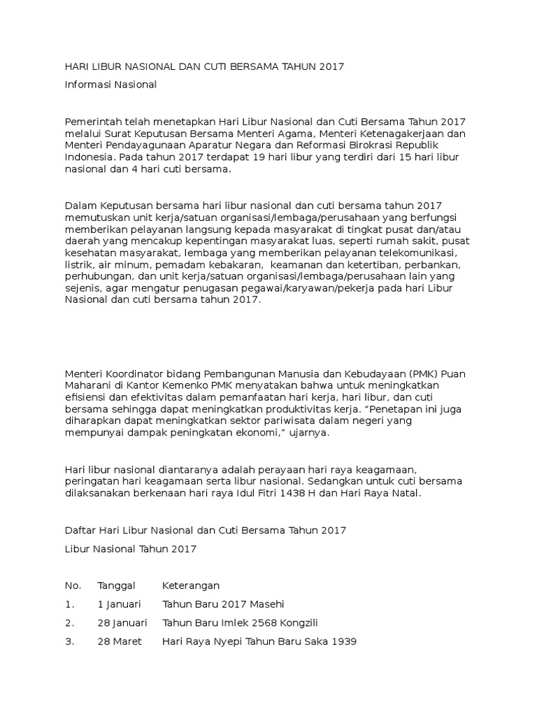 Hari Libur Nasional Dan Cuti Bersama Tahun 2017
