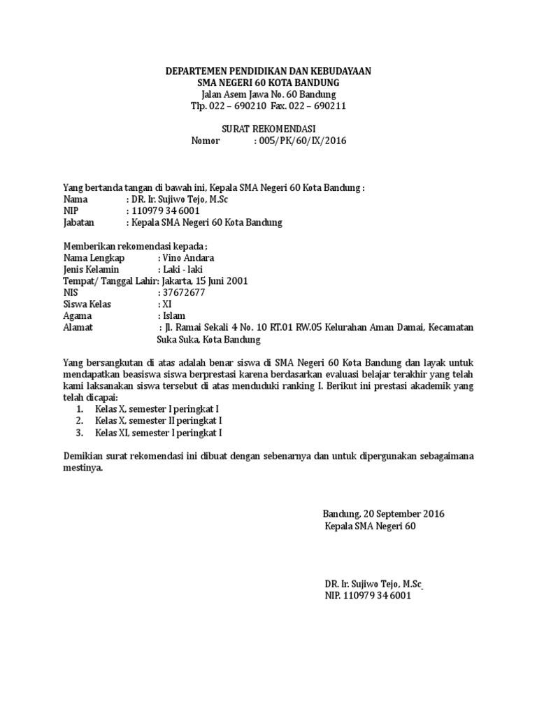 Contoh Surat Rekomendasi Sekolah Untuk Beasiswa Dan Melanjutkan Sekolah