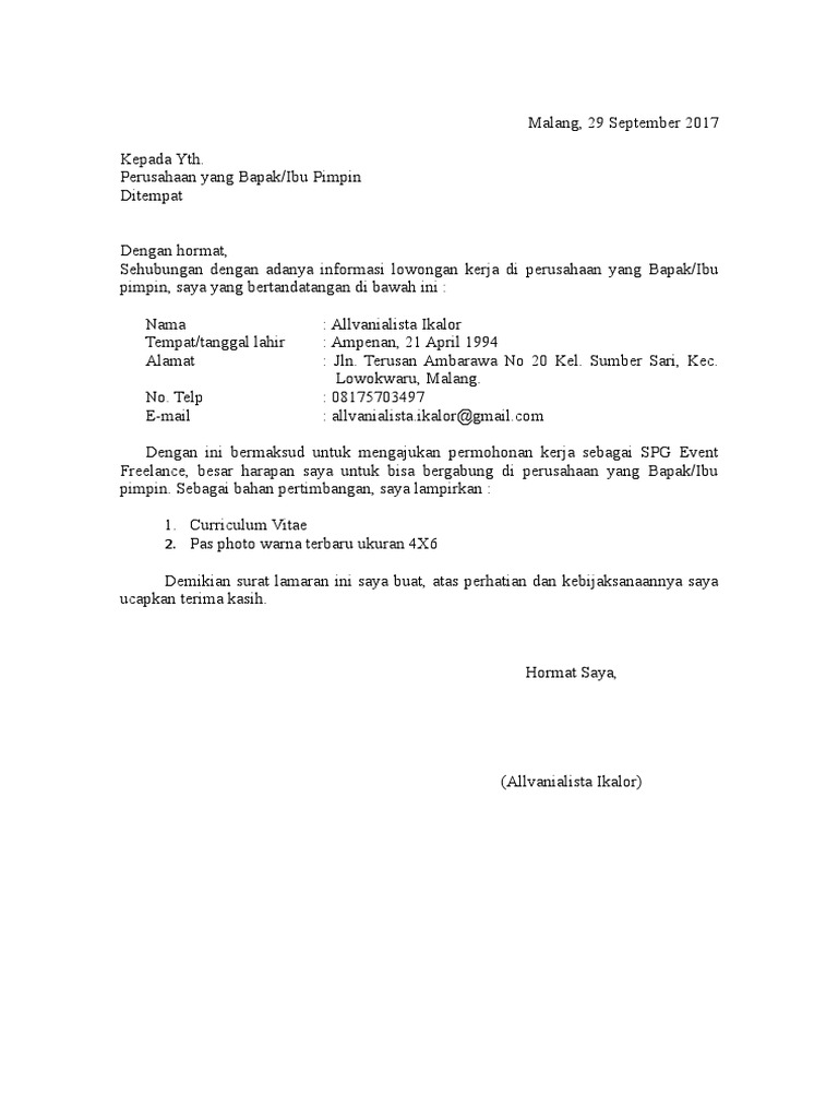 Contoh Surat Lamaran Jadi Spg Contoh Surat