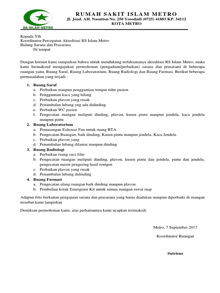 Surat Permohonan Perbaikan Sarana Dan Prasarana