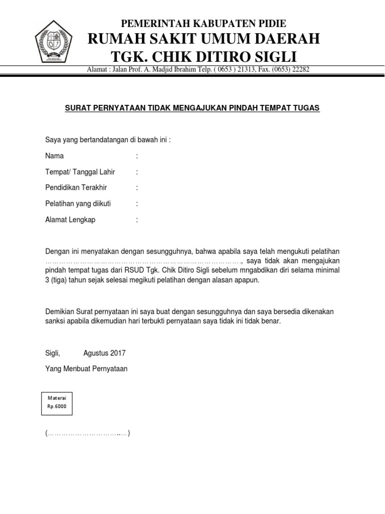 Surat Pernyataan Tidak Mengajukan Pindah Tempat Tugas