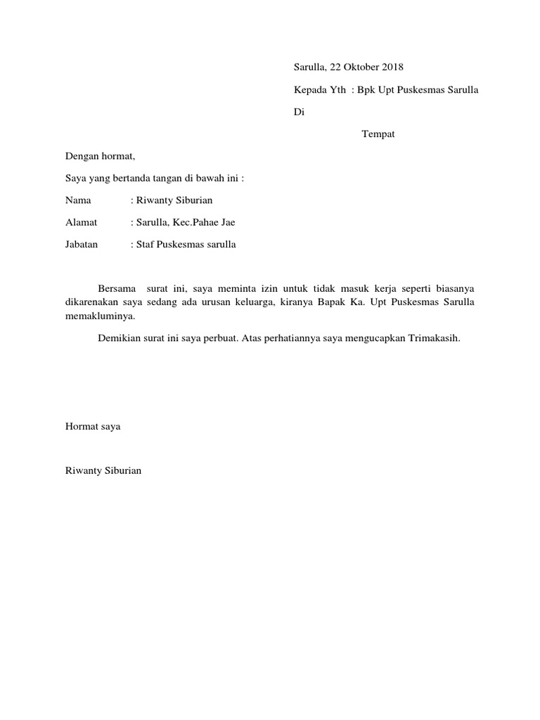 Contoh Surat Izin Tidak Masuk Kerja Karena Ada Kepentingan Keluarga